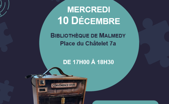 La bibliothèque de Malmedy vous invite le samedi 20 décembre à 14h à participer à un atelier-concert unique animé par Éric Mersch, autour des objets sonores.Un moment de poésie sans les mots, où l’on (ré)apprend le plaisir et la nécessité d’écouter. Les oreilles grandes ouvertes, les participants seront invités à […]