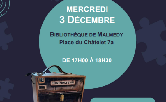 La bibliothèque de Malmedy vous invite le samedi 20 décembre à 14h à participer à un atelier-concert unique animé par Éric Mersch, autour des objets sonores.Un moment de poésie sans les mots, où l’on (ré)apprend le plaisir et la nécessité d’écouter. Les oreilles grandes ouvertes, les participants seront invités à […]