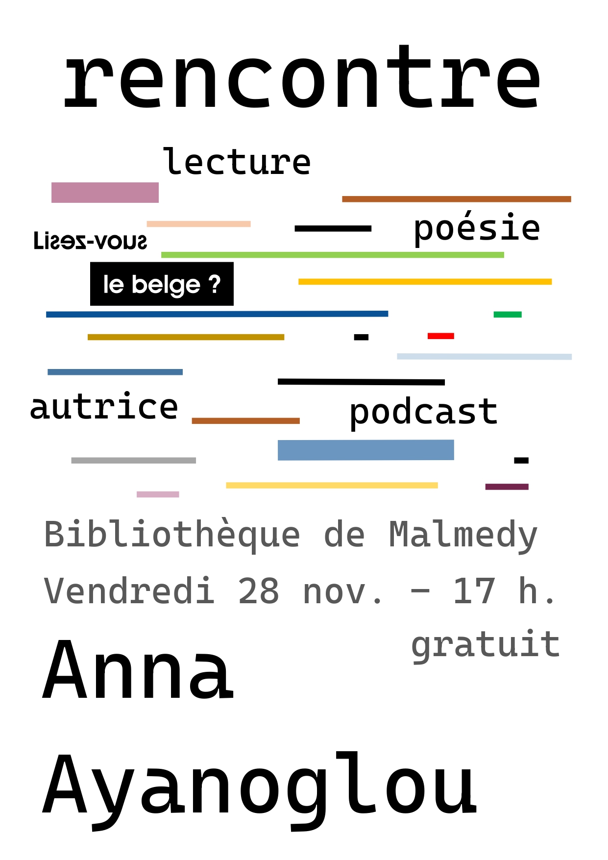 La bibliothèque de Malmedy vous invite à un double événement poétique. Dans le cadre de la campagne « Lisez-vous le Belge ? », nous proposons de venir le vendredi 28 novembre à la rencontre de la poétesse Anna Ayanoglou et de suivre, avec elle, une atelier d’écriture original et ludique en deux temps le samedi 29 novembre .