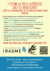 La Bibliothèque de Malmedy et le RéSME s’associent pour placer la santé mentale et la connaissance de soi au centre de l’accès à la culture. Le projet L’estime de soi et la réussite chez les adolescent.e.s – « L’ABC de la connaissance de soi pour une bonne santé mentale » est une clé d’ouverture vers la promotion de la santé mentale et la prévention chez les adolescent.e.s pour améliorer leur bien-être et la résilience psychique. Le projet est une réponse aux questions liées à la connaissance des caractéristiques déterminantes de la personnalité, des compétences, du système de motivation et du système de valeurs.