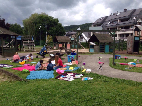 Die zweite größere Aktion, die stattgefunden hat war „Lire dans les parcs“ („Lesen in den Parks“). Hierbei handelt es sich darum, dass sich ein Teil des Teams der Bibliothek an drei Tagen im Sommer in den Parc des Tanneries bzw. auf den Spielplatz, der an diesem angrenzt, begibt, um einen Querschnitt der Bücher der Bibliothek vorzustellen und zu -lesen. Neben Büchern für Kinder, wird traditionell auch eine Auswahl an Büchern für Erwachsene sowie Magazine mit dorthin genommen, so wie Decken und Kissen, die zum Verweilen und Schmökern einladen, sowie auch Spielzeuge aus dem schier unerschöpflichen Bibliotheksfundus. Da Sophie, die Kollegin, die Aktion sonst durchführt aktuell im Mutterschutz ist, wurden Aline, die studentische Hilfskraft der Bibliothek, Camille, die Kollegin, die Sophie während ihrem Mutterschutz ersetzt, und ich als Durchführende eingeplant. Es hieß also zunächst, sich einen Eindruck von „Lire dans les parcs“ in Waimes zu verschaffen. Den Weg dorthin hat Frédéric, ebenfalls ein Kollege, genutzt, um mir noch die Filiale von Wamabi in Sourbrodt zu zeigen. In Waimes konnte ich mir dann anschauen, wie Fabienne und Gaëlle, die Kolleginnen aus den Filialen Waimes und Sourbrodt, diesen Tag gestalten. Danach hieß es dann adäquate Bücher auswählen, überlegen, was außer Büchern sonst noch mit soll und die Decken und Kissen aus Waimes zu organisieren; „Lire dans les parcs“ in Malmedy war gut besucht: neben Belgiern auch Niederländer und arabischstämmige Leute sowie sogar eine Australierin nebst Tochter, die mit ihrem Mann, der aus Malmedy stammt, auf Heimatbesuch war. Zusammenfassend kann ich sagen, dass der erste Tag schnell vergangen ist. Es wurden alle mitgebrachten Spielzeuge eifrig benutzt und Aline hatte viel damit zu tun ihre Bücherauswahl den Kindern nahe zu bringen, während ich die Aktion fotografiert habe und Leute dazu ermuntert habe, sich dazu zu gesellen. Während ich am zweiten Tag der Aktion leider nicht dabei war, ist der dritte Tag buchstäblich ins Wasser gefallen, so dass lediglich das Kindertheater in der Bibliothek stattfinden konnte.
