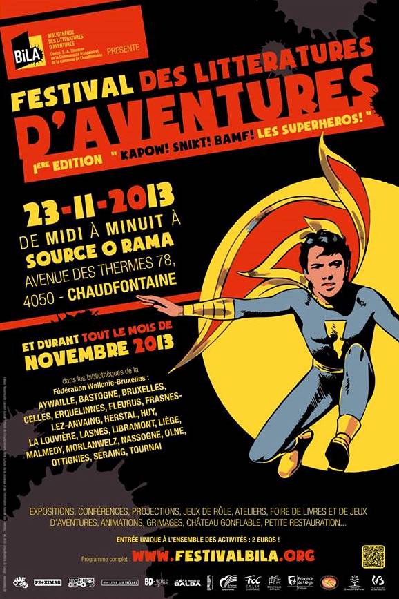 La première édition du Festival Bila aura lieu le 23 novembre. Elle célèbrera les superhéros : foire aux livres, expositions, conférences, projections, rencontres, ateliers, remise de prix, animations pour petits et grands… De midi à minuit, la BiLA investit les espaces de Source’O rama (Chaudfontaine) pour une foule d’activités bariolées. Mais le Festival se décline aussi dans toute la Fédération Wallonie-Bruxelles avec plus d’une vingtaine de bibliothèques participantes qui célèbreront les littératures d’aventures sous toutes leurs formes.