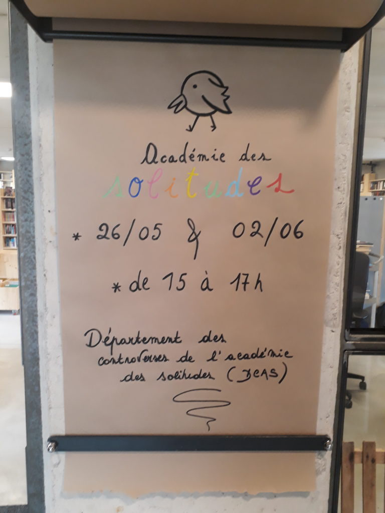 Mars 2021 – Considérant que l’on met tout et son contraire sous le chapeau d’un seul mot (Solitude), Papier Machine décide de créer une Académie des solitudes pour mieux générer discussions et débats, polémiques et fracas, faire le tri dans les intuitions désordonnées, et finir par créer un centre de ressources sonores et publier un livre. Le tout, selon une méthode hautement anticlopédique, sans avoir peur de partir dans toutes les directions, et d’arpenter les sentiers des Solitudes en bonne compagnie.