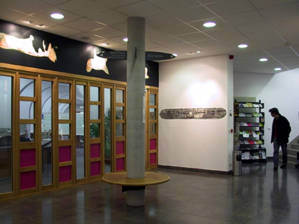 • Des hiéroglyphes égyptiens (argile) en passant par l’écriture cursive (papyrus) jusqu’au pictogramme (impression et découpe par ordinateur). Sur le frontispice, au-dessus des portes d’entrée, sont peints les hiéroglyphes égyptiens qui signifient « Maison des écritures ».
