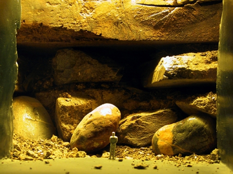 Les niches marquent des étapes dans la cage d’escalier qui mènent les visiteurs à la bibliothèque… Dans chacune d’elles, sont mis en lumière et en histoire différents supports d’écriture : disques durs, papyrus, argile et galets.
