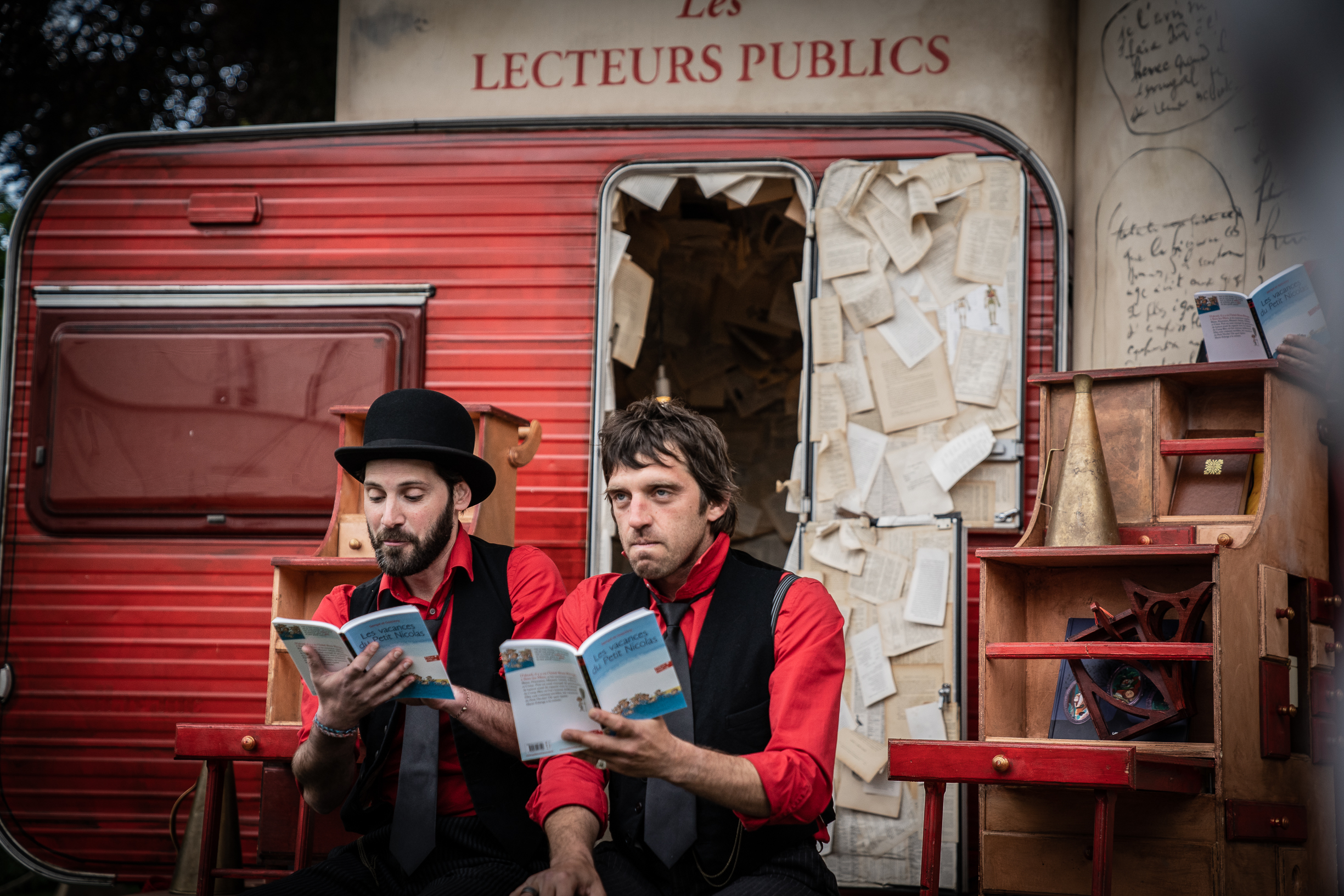 Equipés d’une simple mallette ou de leur meuble mobile les lecteurs de la Compagnie des Bonimenteurs useront de tous les moyens possibles pour atteindre leur but : donner une voix aux textes de leur choix.
