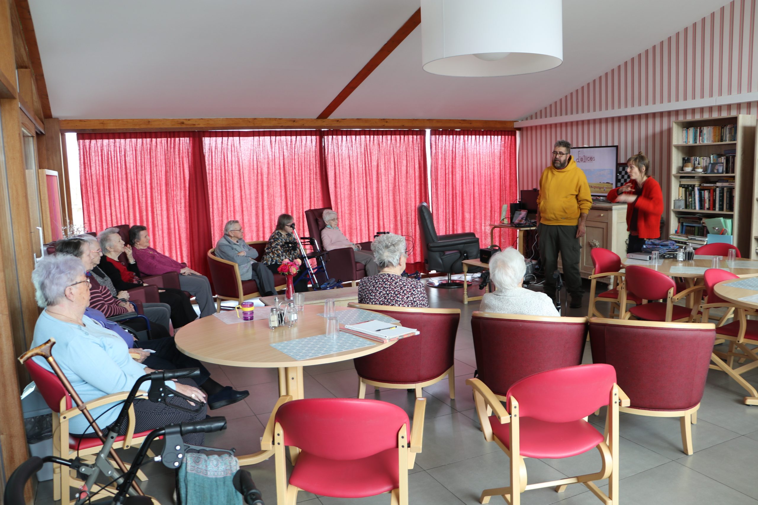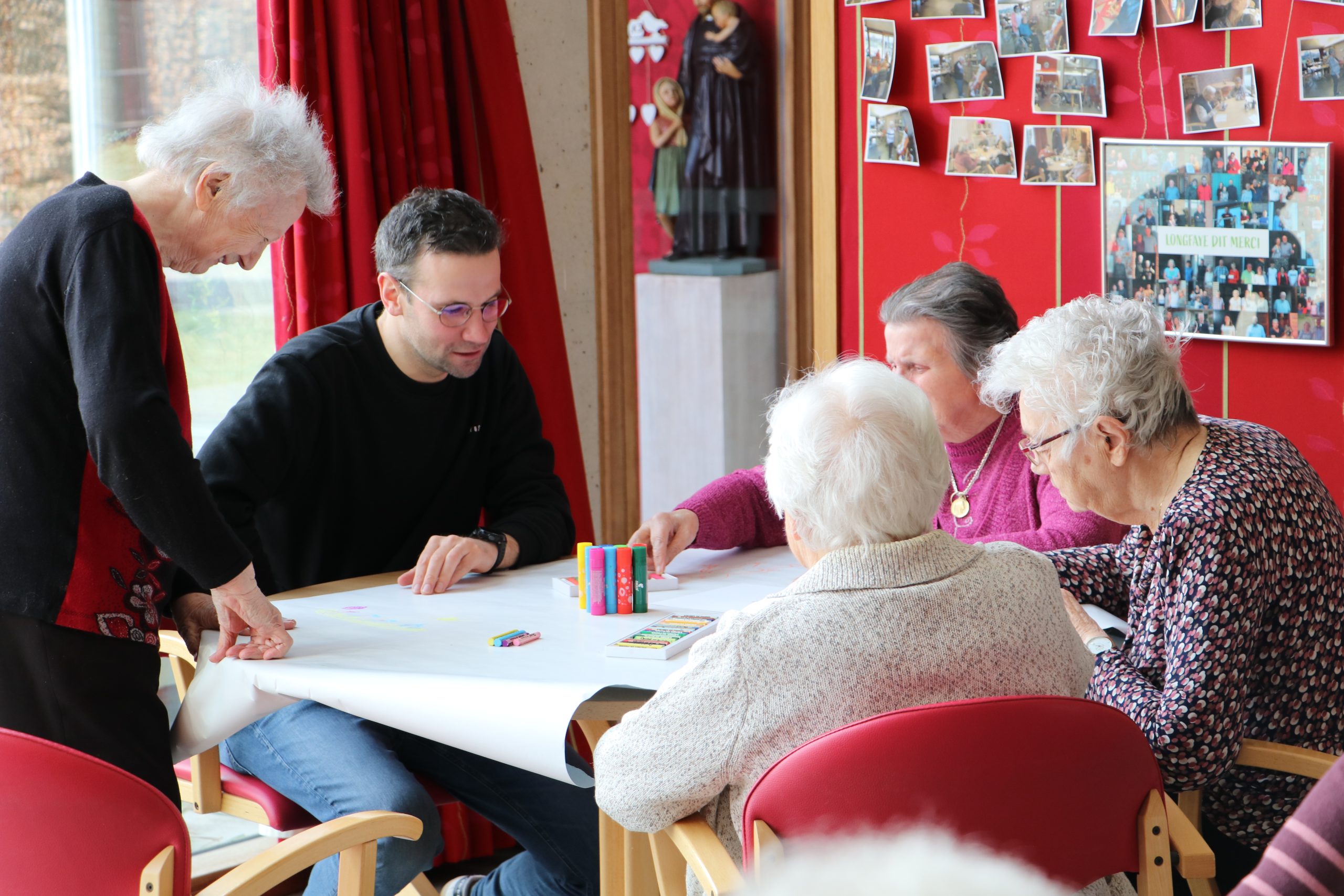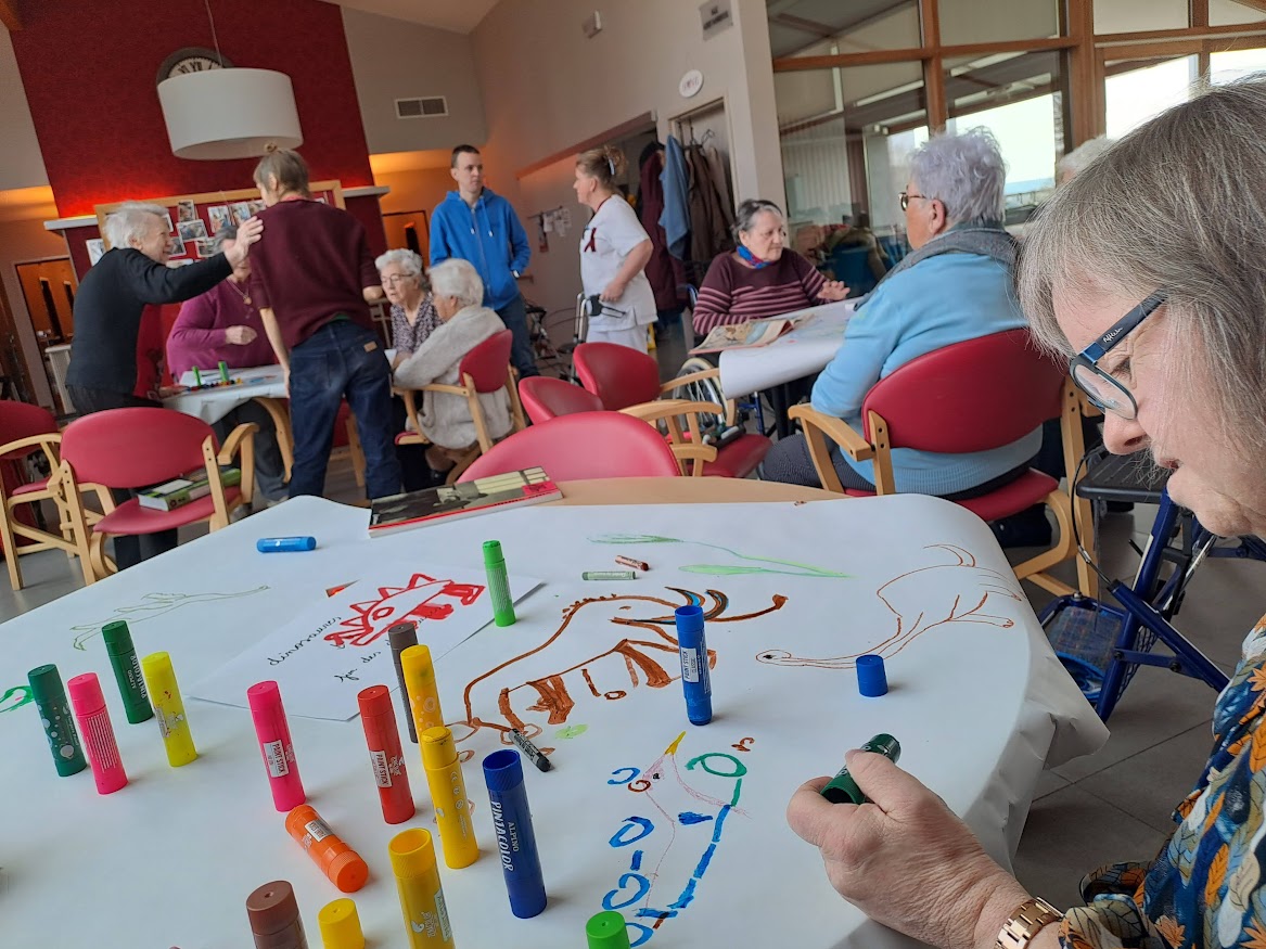Le matin, nous avons voyagé à travers les âges… Le périple s’est déroulé en cinq étapes : de la création du monde à des temps encore inconnus, en passant par la préhistoire, le Moyen-âge ou encore la révolution industrielle… Après la projection, une grande fresque à la gouache a été réalisée par les résidents du Home Saint-Vincent de Paul de Xhoffraix.