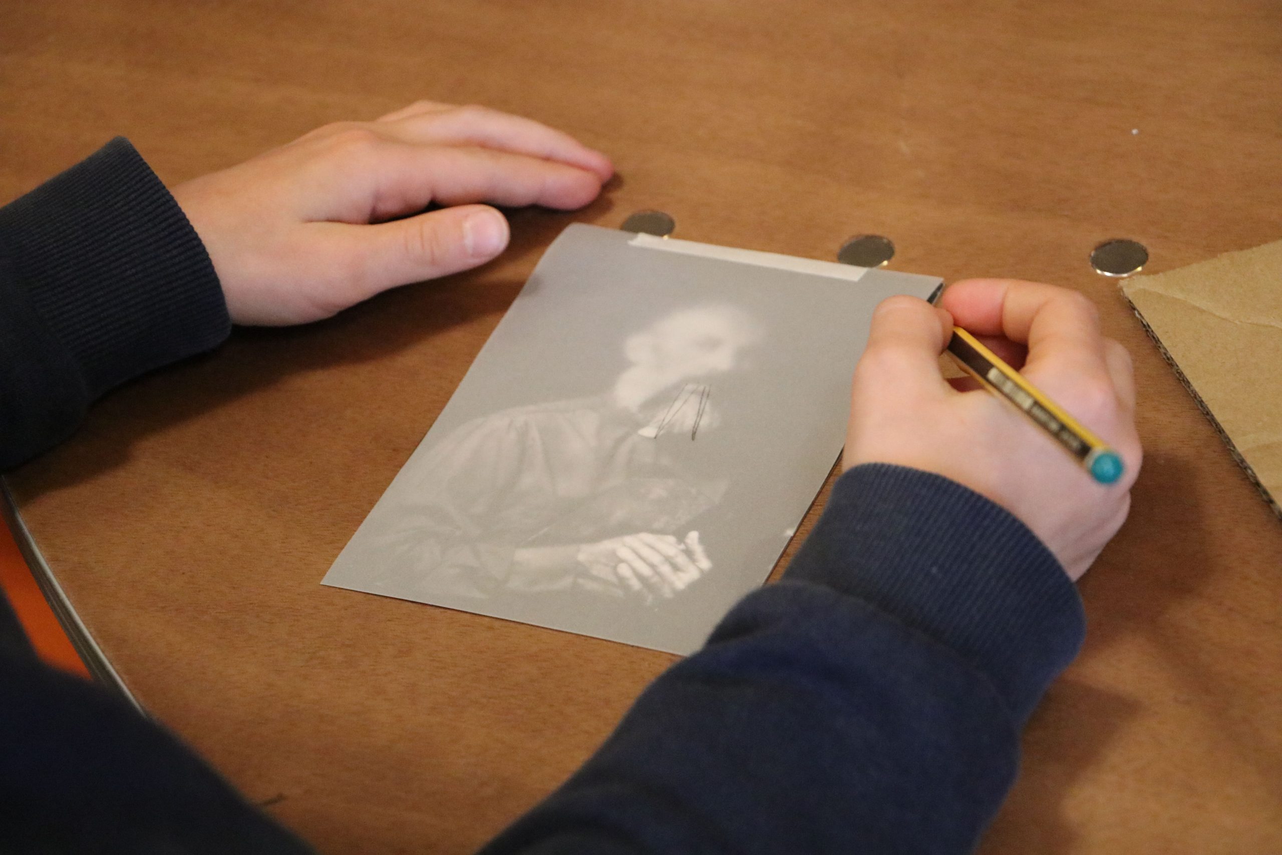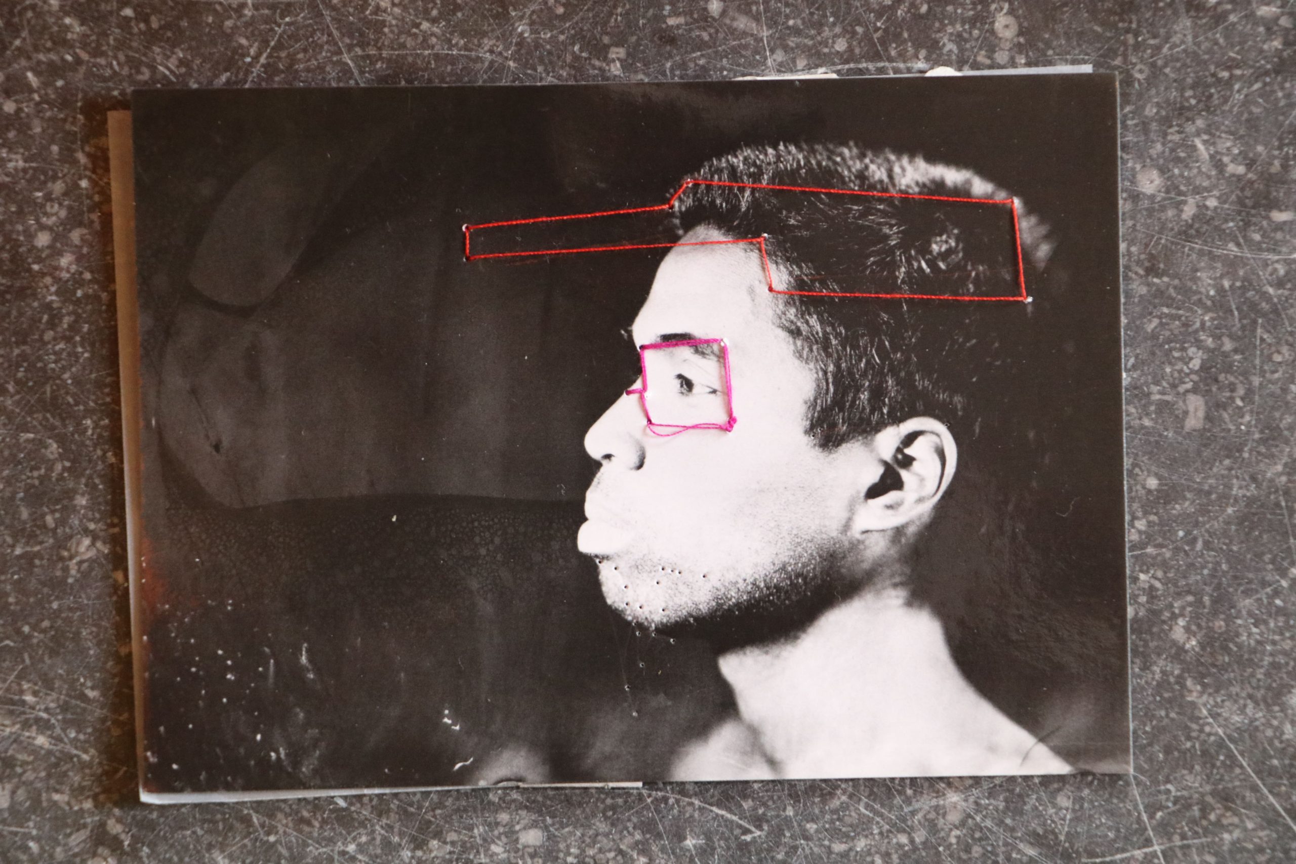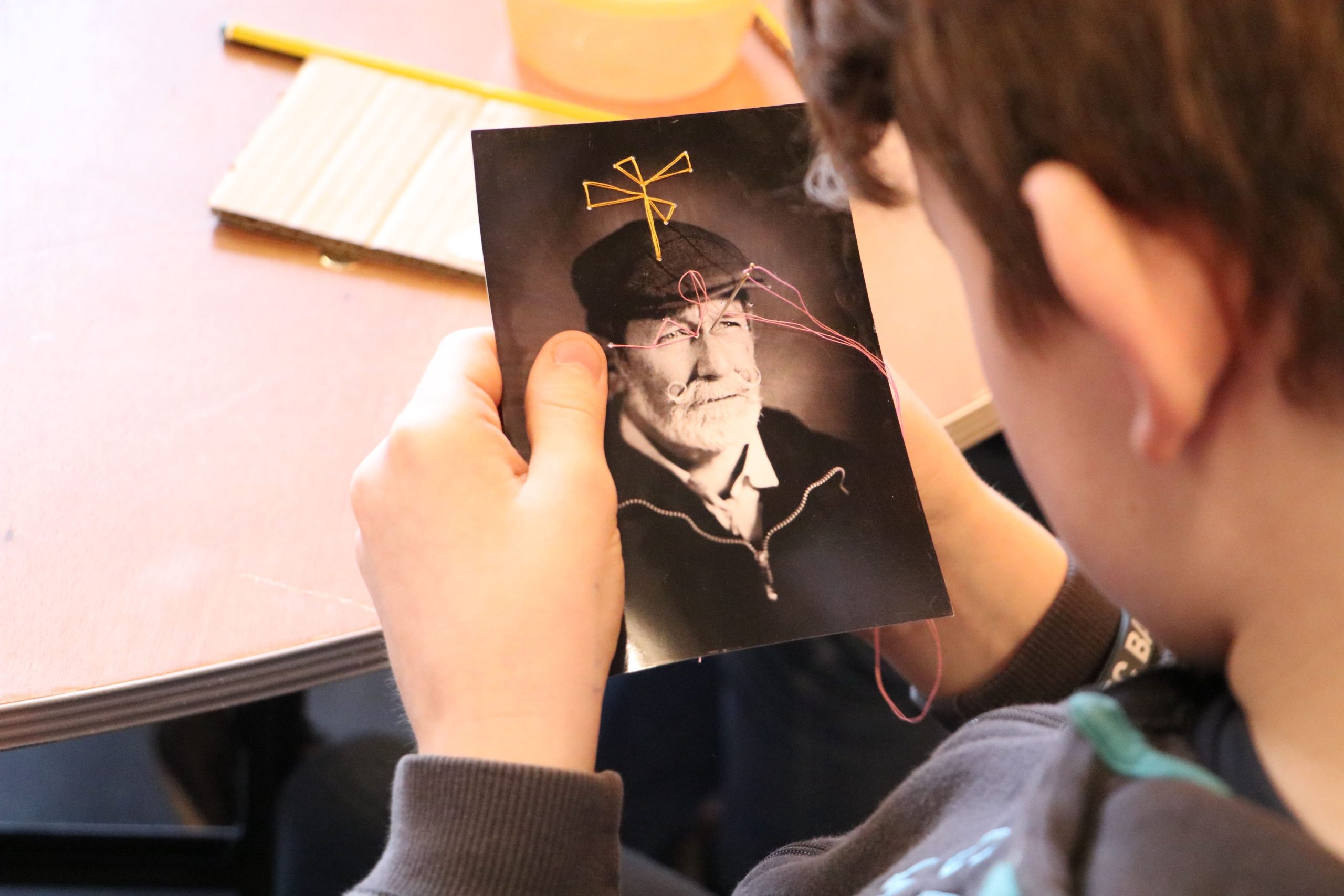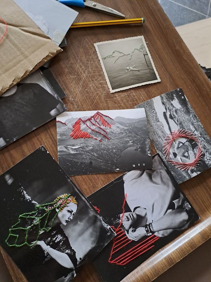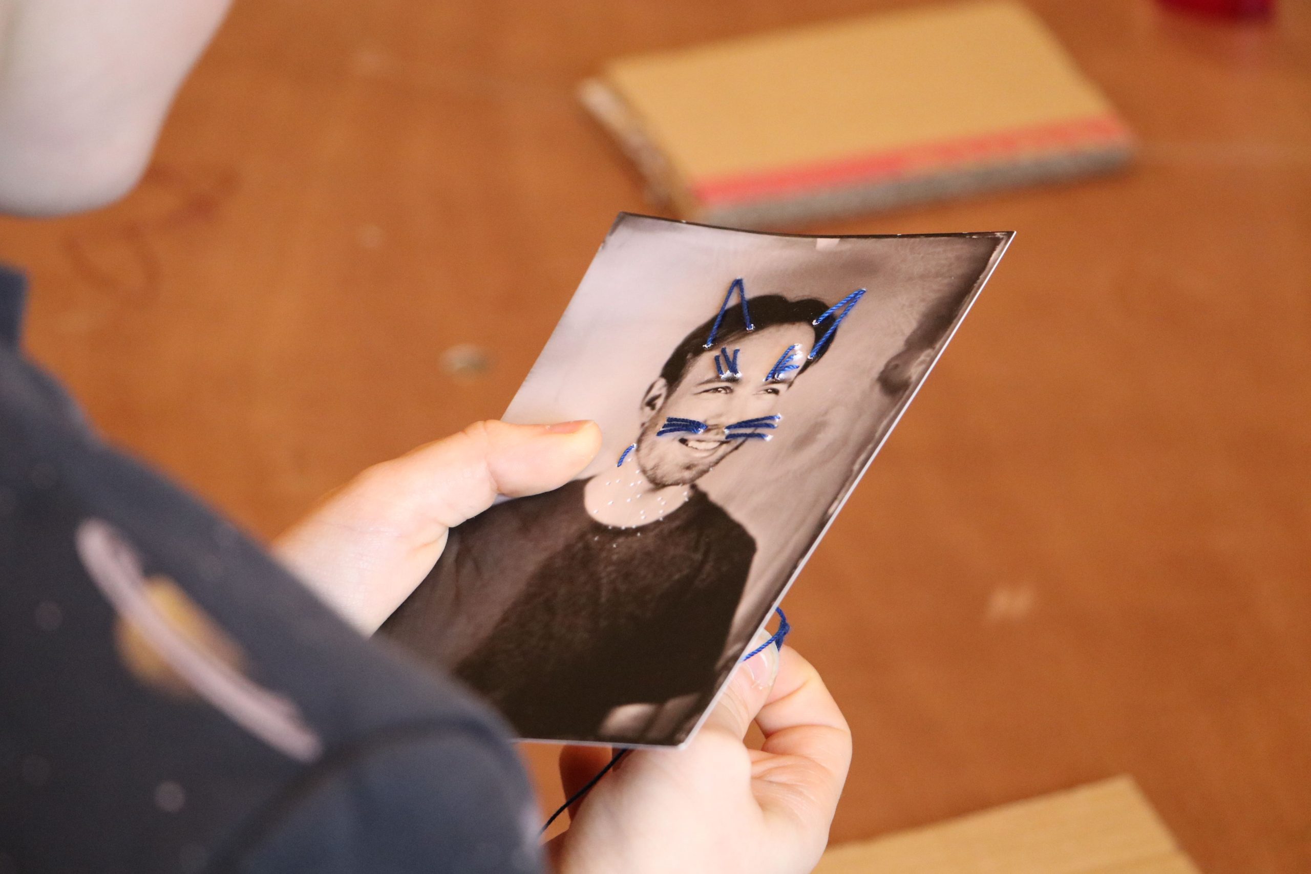 Grâce à la technique de la broderie sur photographie, les participants interviennent en couleur sur des images noirs et blancs pour ré-inventer l’image et la transforme