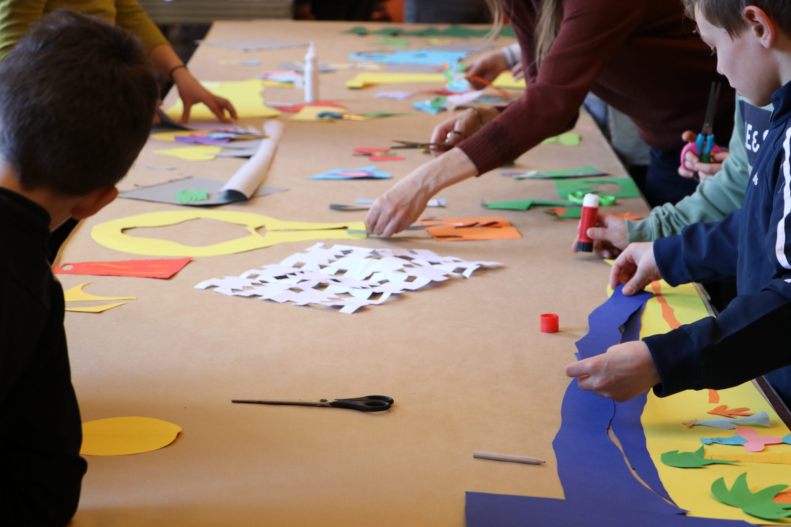 Les enfants ont composé ensemble un grand paysage sur base des films visionnés et des techniques utilisées. Ils ont dessiné et découpé de leurs côtés avant de créer ensemble une grande image finale. A partir des souvenirs filmiques, l’arrière plan en grandes silhouettes unies (morceaux de paysages, forêt, mer, bateaux) s’est constitué, puis le premier plan composé d’images variées (animaux, personnages).