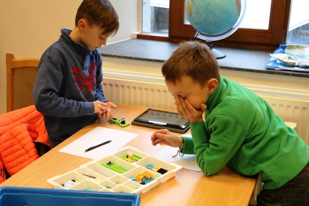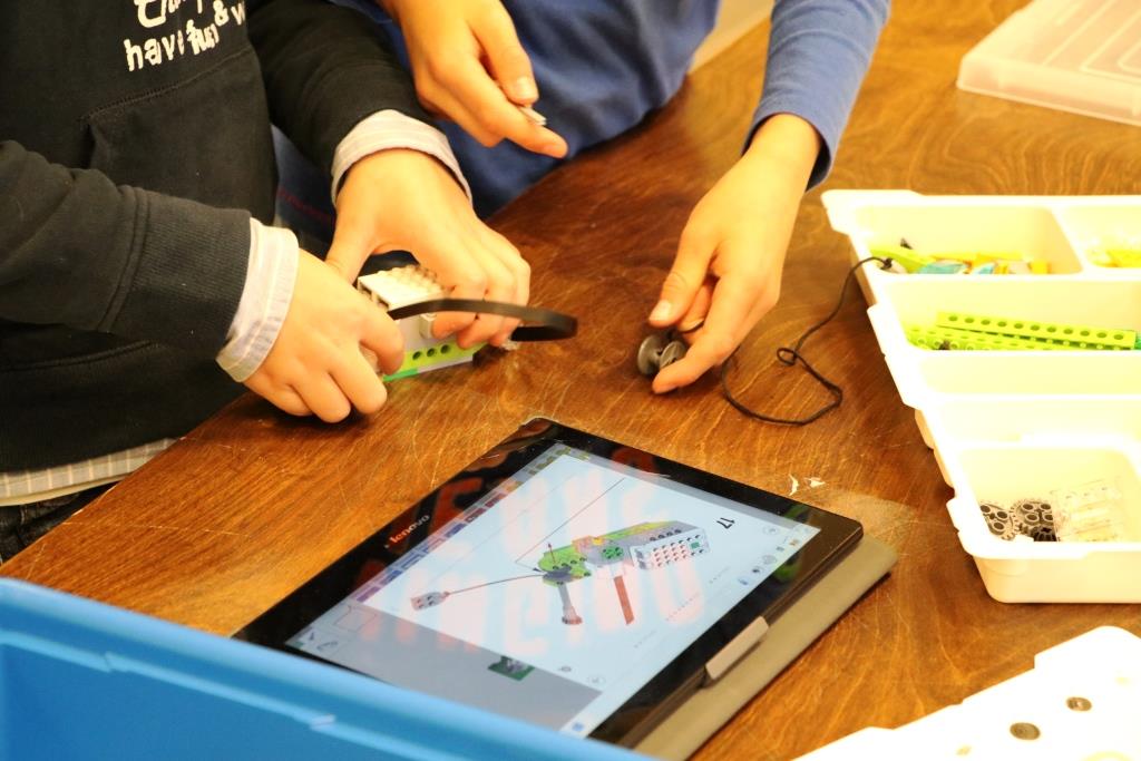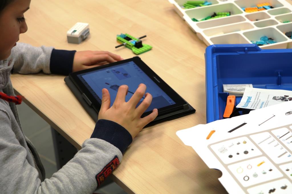 Ensuite, les jeunes ont découvert le kit LEGO WeDo 2.0 (version Education). Ils se sont répartis en duos et ont construit le robot basique en suivant les procédures sur une tablette (via son application).