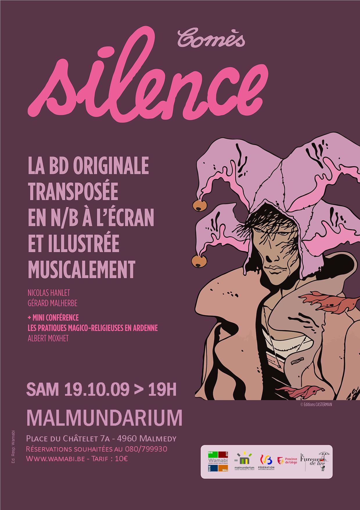 L’histoire se déroule à Beausonge, village imaginaire des Ardennes. « Silence », un jeune homme muet et simple d’esprit, est l’homme à tout faire de l’odieux et brutal Abel Mauvy, riche agriculteur très influent dans le village. Il fait la connaissance d’une sorcière aveugle qui lui révèle le secret de ses origines, ainsi que les raisons qu’ils ont tous deux de se venger d’Abel Mauvy… Le célèbre album de Didier Comès est ici projeté, case par case, sur grand écran et illustré musicalement. Une illustration musicale originale et improvisée qui enrichit la lecture, ouvre vers une nouvelle dimension et entraîne le spectateur dans un univers envoûtant.
