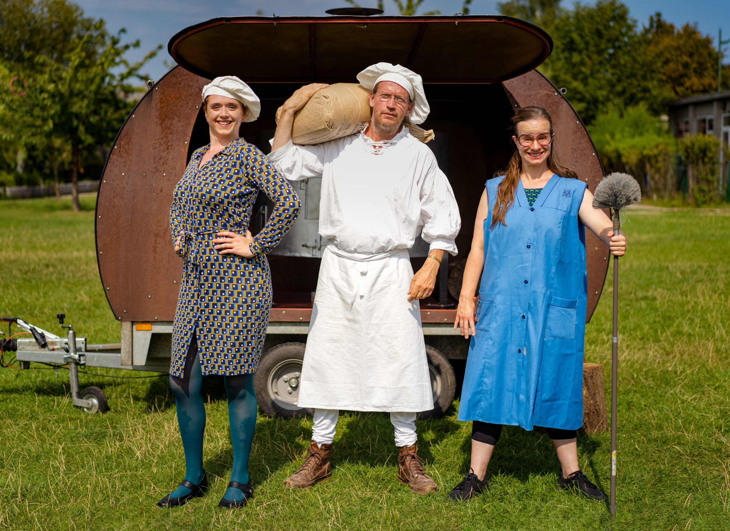 Comédiens : Jeannine Gretler, Jean-François Piazza et Léa Brooking. Regard extérieur: Heike Kossmann. Mouvement: Norman Taylor. Manipulation d’objets: Benji Bernard. Dispositif technique: Benjamin Van Thiel. Design remorque et pétrin : Saoud Mama avec l’aide de Daan Desmet et Jean-François Piazza pour la fabrication. Costumes : Clotilde Coppieters. Mise en forme de la finale bande son : Chris Devleeschouwer. Création: Jeannine Gretler, Jean-François Piazza et Stefan Sattler