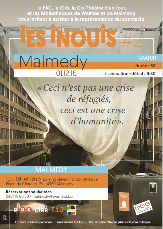 Le camion-théâtre du Théatre d’un jour fait escale à Malmedy le 1er décembre pour vous présenter son nouveau spectacle « Les Inouis.2 » sur le thème des réfugiés. Bienvenue!