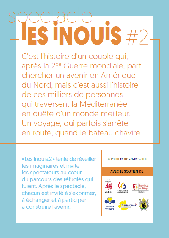 « Les Inouis.2 » a pour ambition de provoquer les consciences, de réveiller les imaginaires et de placer le spectateur au cœur d’une expérience intime, physique et poétique, en croisant des récits de vie. De ceux qui, après la seconde guerre mondiale, fuyaient en héros vers le sud de la France, le ventre noué par la peur de revivre les atrocités de 14-18, ou de ceux qui, aujourd’hui, jouent leur vie à pieds ou dans la cale d’un bateau pour rejoindre l’espace Schengen. Et puis certains de nos aînés qui partirent dans les années 50 chercher ailleurs un travail qui faisait cruellement défaut sur notre territoire…