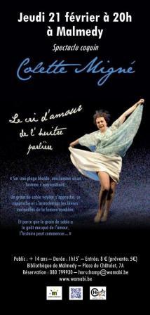 La conteuse toulousienne Colette Migné fait escale à Malmedy le 21 février 2013 à 20h pour le régal de toutes les oreilles friponnes. Son spectacle intitulé « Le cri d’amour de l’huitre perlière » est une création érotico-délirante sur la vie sexuelle et véridique des mollusques et des crustacés. A voir absolument!